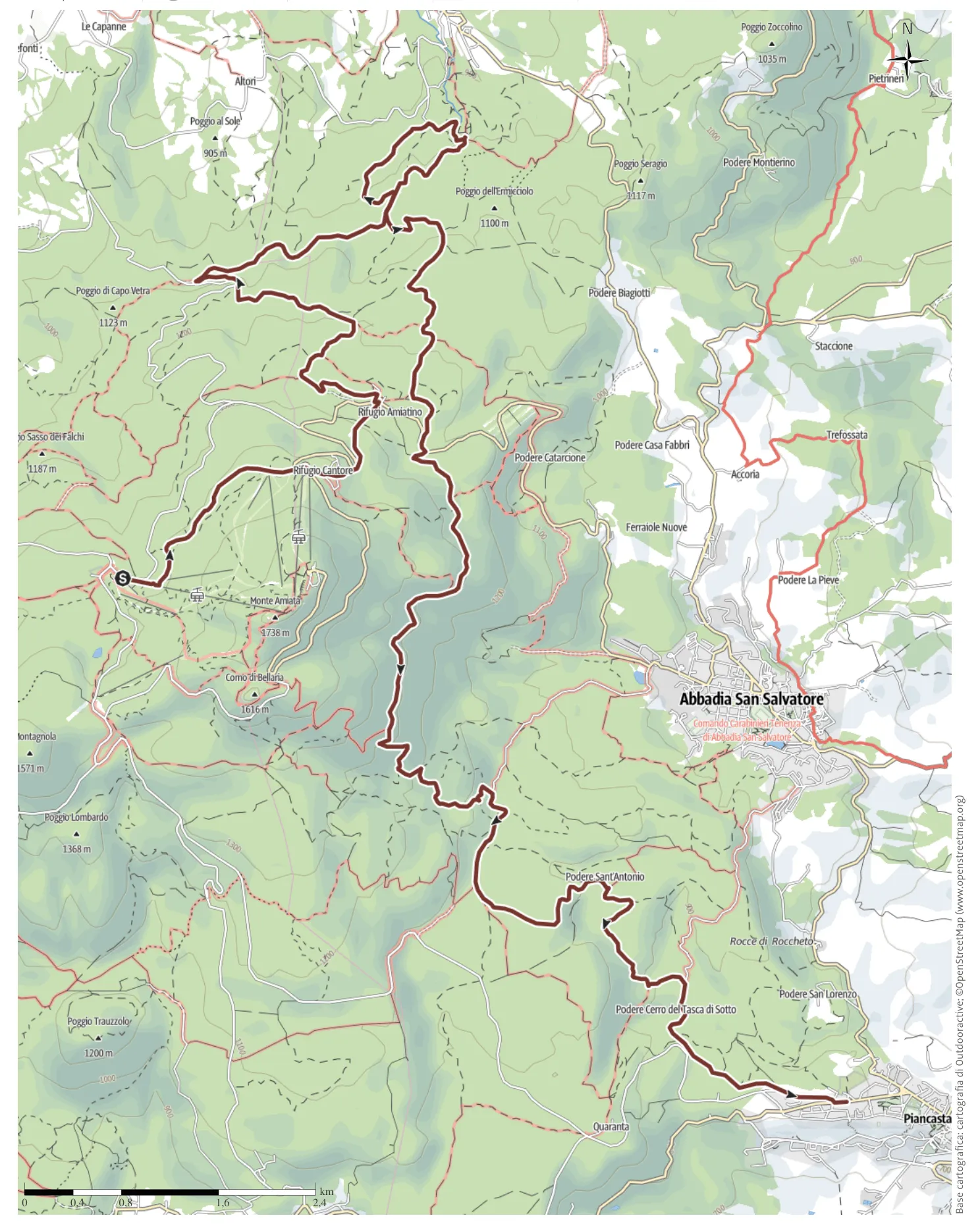 E infine un’ultima discesa per raggiungere le mete finali di Abbadia San Salvatore e Piancastagnaio, attraversando il Podere Cipriana o i ruderi del vecchio Podere Sant’Antonio, testimoni di quella cultura contadina che sfidava i rigori climatici delle altitudini, circondata e protetta dai boschi del Vulcano Amiata.