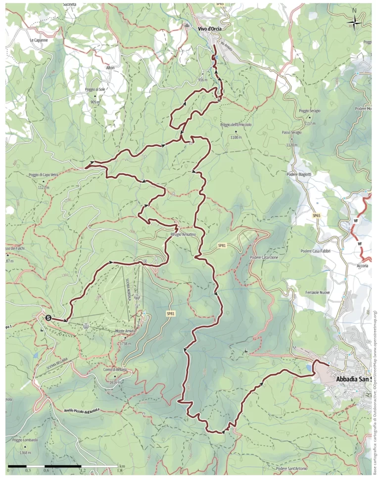 La partenza è in quota, al Prato delle Macinaie, ma può essere anche alla Vetta sfruttando le alternative descritte nel Settore Azzurro. La Faggeta più estesa d’Europa accoglie i primi sentieri “Arancioni” del Cammino, portandoci prima a Marsigliana e Cantore attraverso il comodo tracciato de “Le Gobbe di Cammello”. Poi giù in picchiata verso il Primo Rifugio e ancora a scendere fno al pittoresco Rifugio Capovetra, che sembra una casa delle favole, con la sua fontana di acqua freschissima. Ci si incammina poi in un sentiero che dopo un po’ diventa un’ampia carrareccia lungo la quale incontriamo il gigantesco Faggione per poi venire accompagnati, sulla destra, da una imponente colata lavica che ci farà compagnia fno alla deviazione verso il villaggio di Vivo d’Orcia. Scendiamo così nei castagneti per raggiungere l’Ermicciolo e la sorgente che abbevera gran parte della Provincia di Siena. E poi di nuovo il sentiero si impenna fno a tornare al Primo Rifugio e poi sù verso l’imponente Sasso della Culla con la scultura del compianto Giancarlo Baiocchi, detto il “Tacco”, che ci in direzione Vivo d’Orcia.